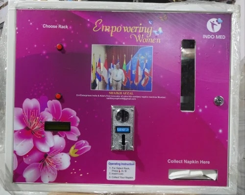 Specification for Automatic Sanitary Napkin Vending Machine:- Ø Model : Vend hundred Ø Capacity: 50 Napkins Ø Mode: Battery / Electric Ø Napkins Size: Any brand /Any size of napkin can be used Ø Currency value: Accepts 1, 2, 5, and 10 rupees coin or any special token Ø Process: Automatic vending Ø Weight :22 kg Ø Dimension : Lx W x H = 21 x 26 x 7 Inch. Ø Operation process: Automatic Advantage of napkin vending machine Ø Immediate access to napkin any time of the day to make menstrual emergencies. Ø The convenience of purchasing the product independently. Ø Self dispensing of the napkin at the drop of the coin. Ø Save the embarrassment of seaking napkin in the peer group or from authorities USPS of vending machine. Ø Vending machine can be calibrated to accept coins of any country by just inserting sample coin. Ø Vending machine can be catered to specifications of the sanitary napkins of any brand and any size. Ø Vending Machine will be Battery operated manufactured for area with power supply.